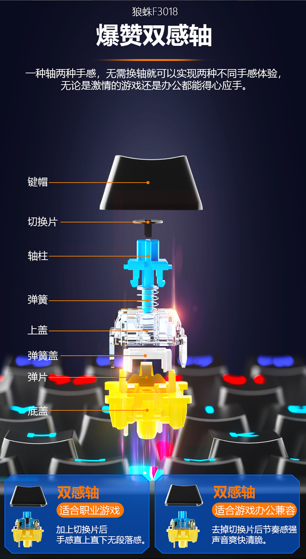 一把键盘两种手感?不信你来看看,狼蛛F3018双感轴机械键盘 更换切换片视频